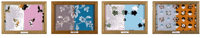 Blow-up-Tapeten Die Künstlerin transformiert Tapetenmuster mittels Acryl- und hochglänzenden Kunstharzfarben in flächige Malerei. Vertrautes wird aus gewohnten Zusammenhängen herausgelöst und zu etwas ganz Neuem. | |