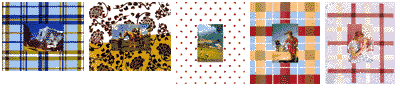 Postkartenbilder Die Kombination von Postkartenmotiv mit Ornament- und Karomustermalerei ergibt einen ironischen Kommentar zur Heilen-Welt-Idylle. | |