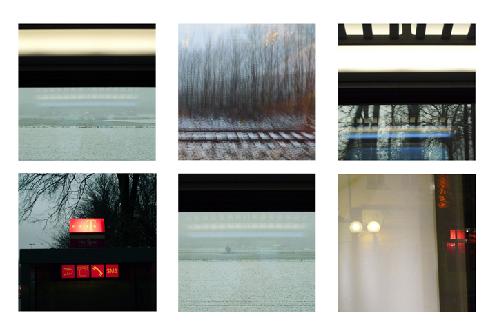 Schatten am Bahnsteig, grau gestreifte Wartehäuschen, Regen tropft auf Glas. Nichts Besonderes geschieht.