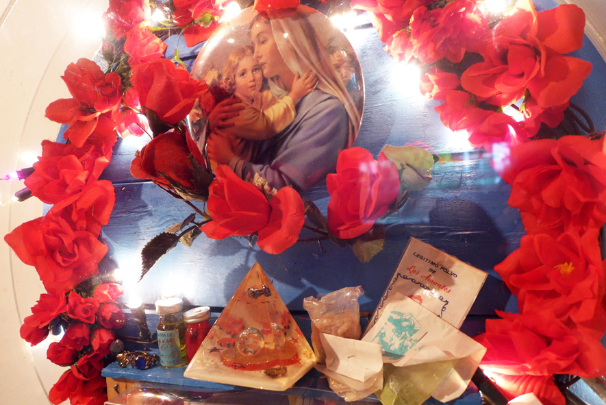 Draußen ist es düster und grau, drinnen blinken bunte Lichter ... "Ich habe meine Kindheit in Lateinamerika verbracht. Da gibt es jede Menge bunte und glitzernde Lichter und Blumen in den Kirchen und Kapellen." Elemente aus dieser Welt mit ihrem bunten Kitsch hat SWS mit Gegenständen aus Deutschland ... verknüpft.