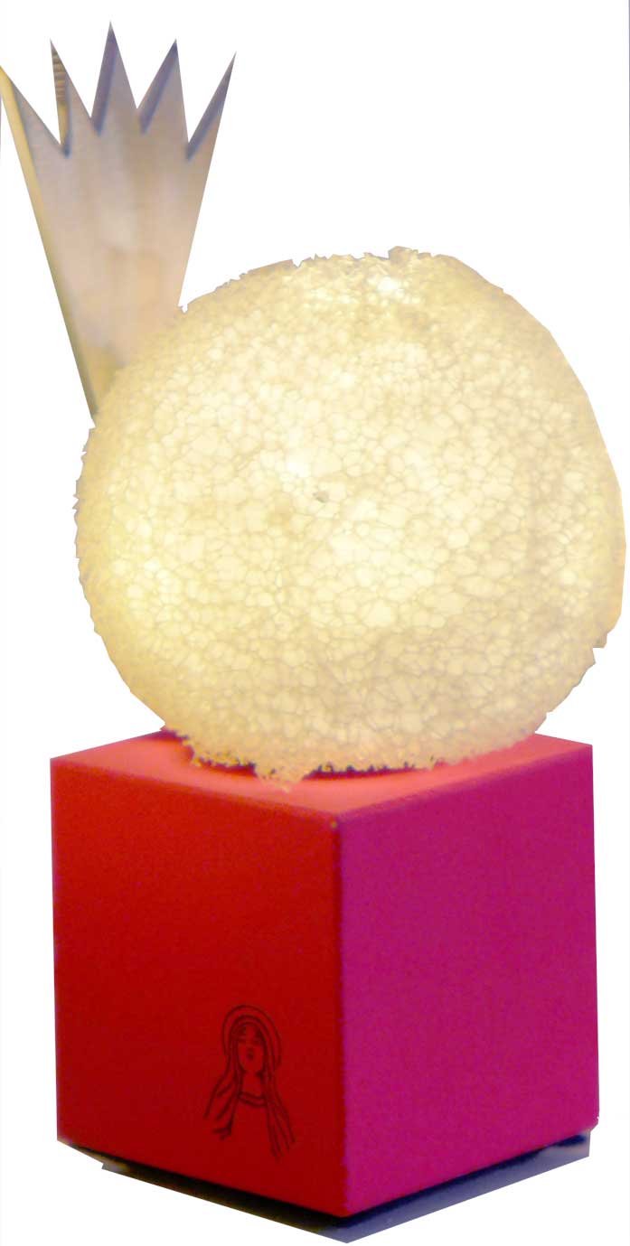 Die Wandobjekte mit den Madonnen sind nicht nur idyllisch und harmonisch sondern zeigen, dass die Welt im 21. Jahrhundert aus Gegensätzen besteht. Und davon gibt es bei den Marias jede Menge: Die Mutter des Krieges lauert hinter Stacheldraht, die Mutter der Liebe lockt mit einem riesigen roten Mund aus Plüsch: Und das soll alles die Heilige Maria sein?...